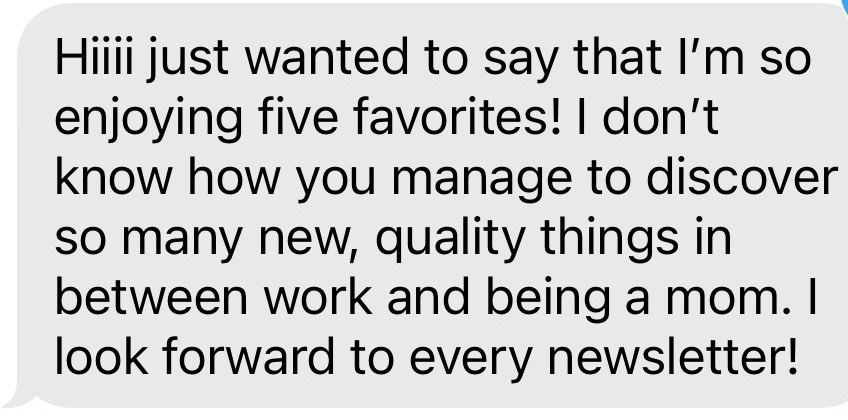 When you subscribe, every new issue goes directly to your inbox. You can also read it on the website, or in the Substack app. Questions? I can be reached at fivefavoritesnewsletter@gmail.com.